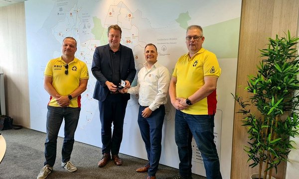 Algemeen Directeur Jaap Donker heeft uit handen van een delegatie van de Reddingsbrigade de ‘NRV-waarderingsmunt hoogwaterramp juli 2021’ ontvangen. “Als blijk van waardering voor de prettige en constructieve samenwerking tijdens de overstromingen in Limburg vorig jaar zomer”, aldus Mark Peeters, Regiocoördinator bij Reddingsbrigade Nederland.