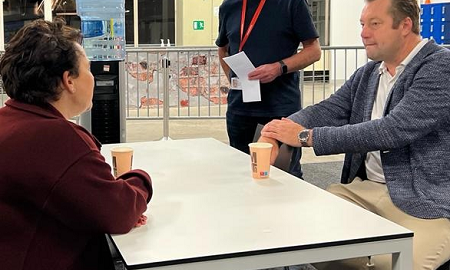 Om de schrijnende en onhoudbare situatie in Ter Apel te ontlasten, zijn afgelopen vrijdagavond 100 asielzoekers met bussen overgebracht naar de Jaarbeurs. Hier konden de mensen op adem komen, kregen soep en broodjes en konden gebruik maken van een douche. Vooral met dat laatste waren zij erg blij. VRU directeur Jaap Donker en voorzitter van de VRU Sharon Dijksma gingen op bezoek bij de Jaarbeurs om de medewerkers een hart onder de riem te steken.