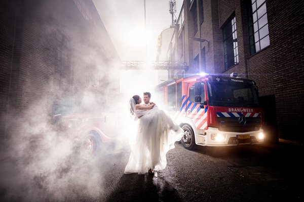 Dat brandweerleven sijpelde zelfs door tot hun bruiloft. Er stond een tankautospuit bij de deur, Patrick kwam aan in de oude opoe, de ringen lagen in een miniatuur brandweerwagen en de trouwambtenaar vertelde hun verhaal aan de hand van een speelgoedbrandweerwagen met uitschuifladder. Voor de gelegenheid had ze één van de twee brandweerpoppetjes (waarvan er ééntje een vrouwenfiguur was) voorzien van een sluier. Natuurlijk zaten er flink wat brandweercollega’s in de zaal — dat zijn tenslotte gewoon je vrienden. “En ja,” lacht Nicky, “de foto’s zijn echt compleet brandweer. Maar dat past gewoon bij ons.”