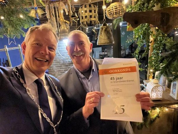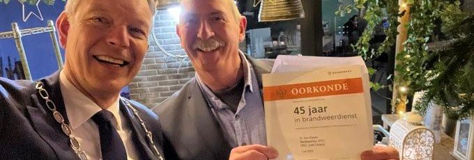 Voor je het weet doe je het werk 45 jaar. Ik ben dan ook trots op het ontvangen van deze onderscheiding. Als je jong bent doet dat je minder. Eerdere brandweeronderscheidingen kwamen in de doos te liggen met zwemdiploma’s, avondvierdaagsemedailles en meer van dat. Nu ben ik ouder en heb ik kleinkinderen. Zij rommelen dan wat in die doos en vragen ‘opa, wat is dit, hoe kom je hieraan?’. Dat heeft toch geresulteerd in een mooie vitrine met alle onderscheidingen. De kleinkinderen vinden dat fantastisch, die kijken er veel naar. Deze laatste heeft me echt doen realiseren hoe lang ik dit al doe en wat ik allemaal heb meegemaakt. Collega’s zijn ervoor m’n geschiedenis weer ingedoken, dan komt alles weer naar boven. Dat maakt alles wat je hebt neergezet in die jaren belangrijker.